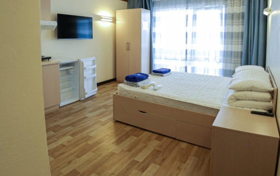 В номере: кровати односпальные /одна двуспальная кровать, кухонная мебель, прикроватные тумбочки, стол, стулья, мини-кухня, кондиционер, мини-холодильник, набор посуды, плита электрическая, телевизор, электрочайник