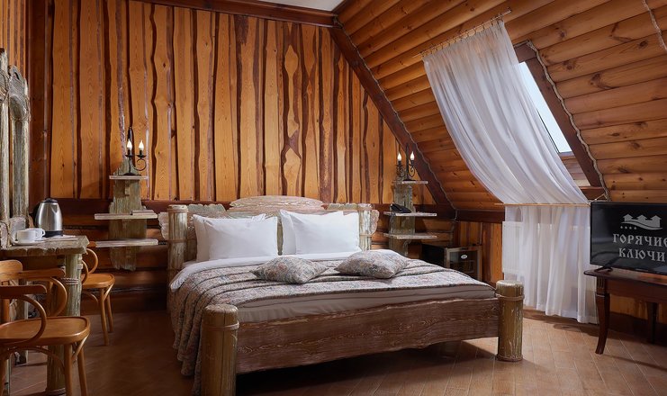 В номере: вешалка, диван, зеркало, кровать двуспальная, прикроватные тумбочки, стол, стулья, шкаф, кондиционер, мини-холодильник, телевизор, телефон, холодильник