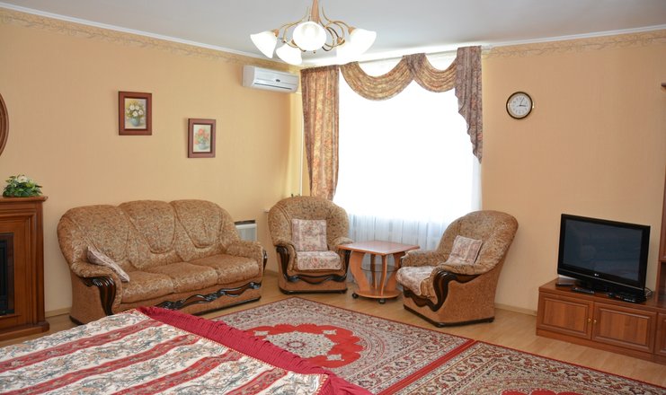 В номере: стол, 2 стула, шкаф, гладильная доска, кондиционер, микроволновая печь, телевизор, утюг, холодильник, электрочайник, мягкая мебель, 2 односпальные кровати, двуспальная кровать (ширина 160 см), кухонный гарнитур, WI-FI, набор полотенец, расширенный набор посуды, предметы индивидуального пользования.