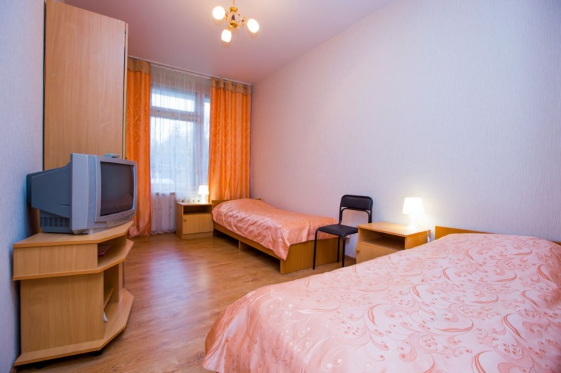 В номере: ТВ, холодильник, шкаф для одежды, стулья, тумбы, две кровати.